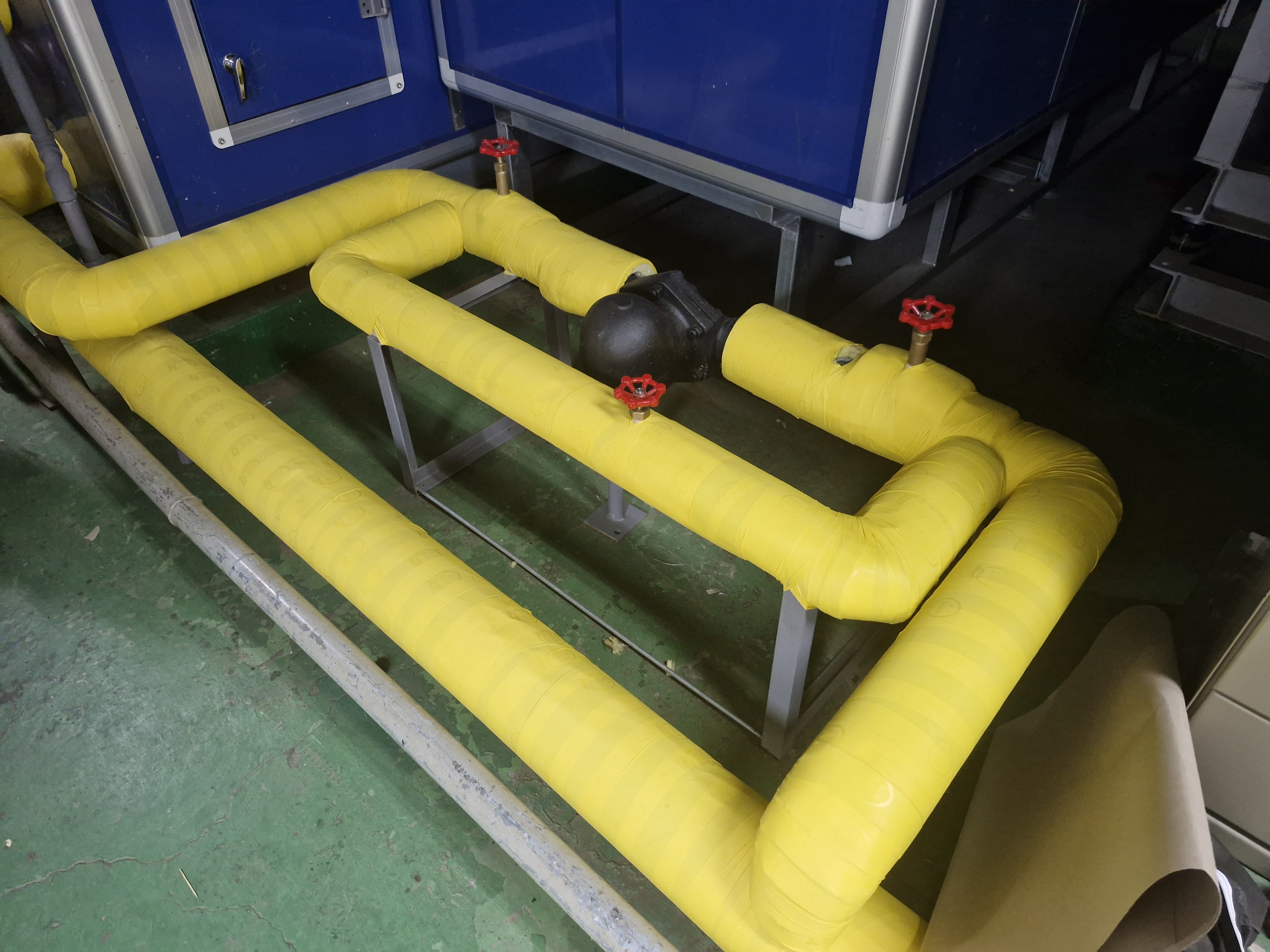 스팀배관에 유리 섬유로된 관을 씨워서 저 노랑색 보온테잎으로 장인들이 직접 손으로 하나하나 돌돌 감싸는 작업니다.