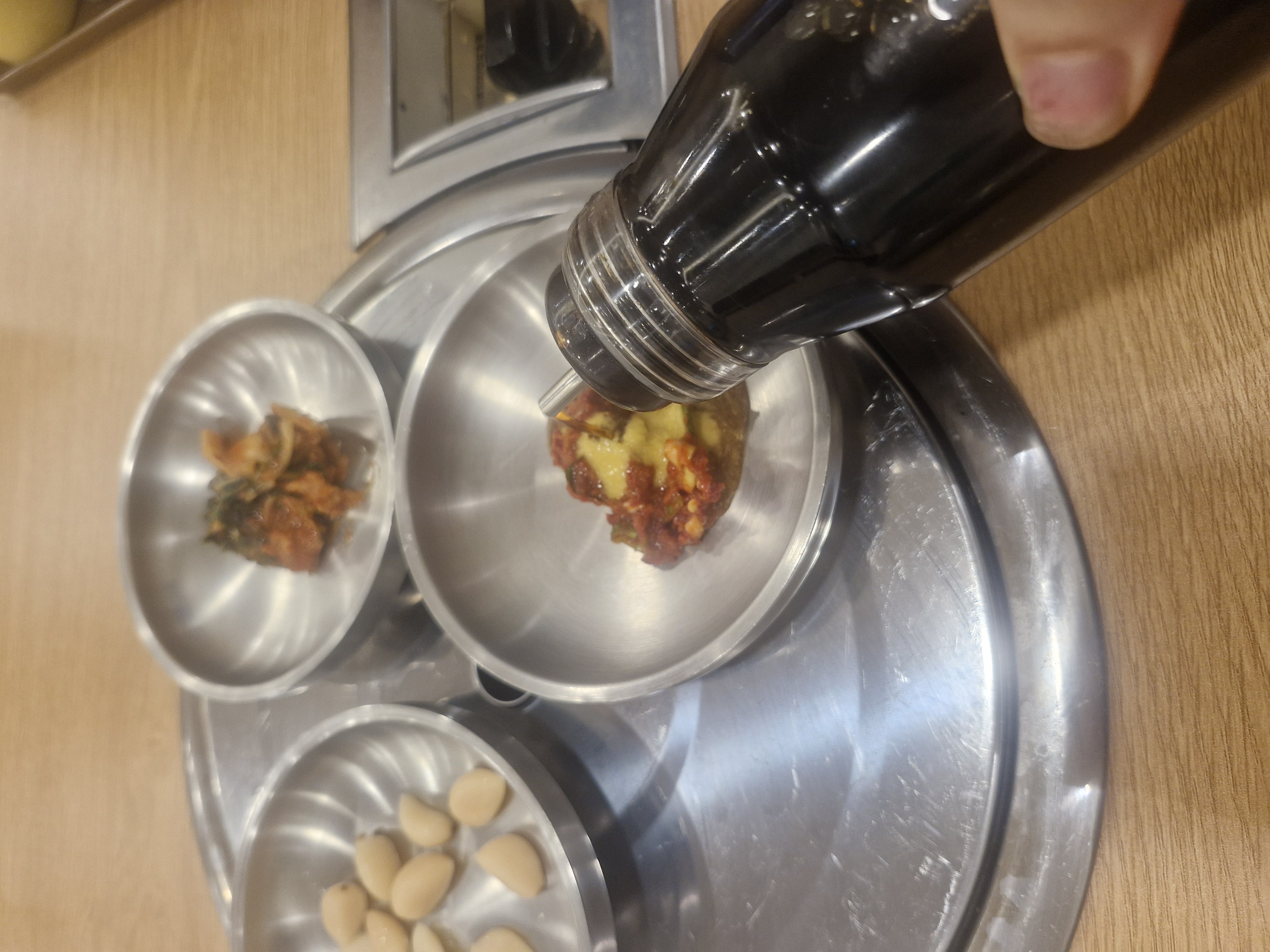 앞접시에 날개를 쭉 찢어서 만들어 놓은 양념장에 찍어 먹어봅니다.